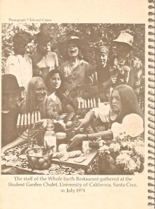 I landed on this particular Whole Earth in 1970 upon returning to UCSC after a year in Munich. My friend, housemate, & Cordon Bleu graduate Karan, who unlike me could actually cook, had similarly returned a few weeks earlier, gotten a job at the newly envisioned ‘natural foods’ restaurant, & apparently convinced Sharon that I might be a decent dishwasher/cashier. Over the next two years (future husband) R & I became friends over kitchen scraps, midnight chats (i.e., I talked & he listened) & pots of hard-boiled eggs. When we took a break from those dishes or from preparing sandwich fixings for the next day’s lunch crowd, I managed to finish my last two years of anthropology courses while he hopped around the country on freight trains. We only fell madly in love after I graduated & it dawned on me that the easy camaraderie of the restaurant would be lost as we both moved on. Or at least that’s my version of the story.